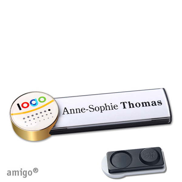 10 Namensschilder amigo alu-print Magnet anthrazit | Edelstahl-Rastnadel | square | weiß | gold, Metall