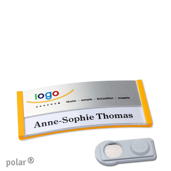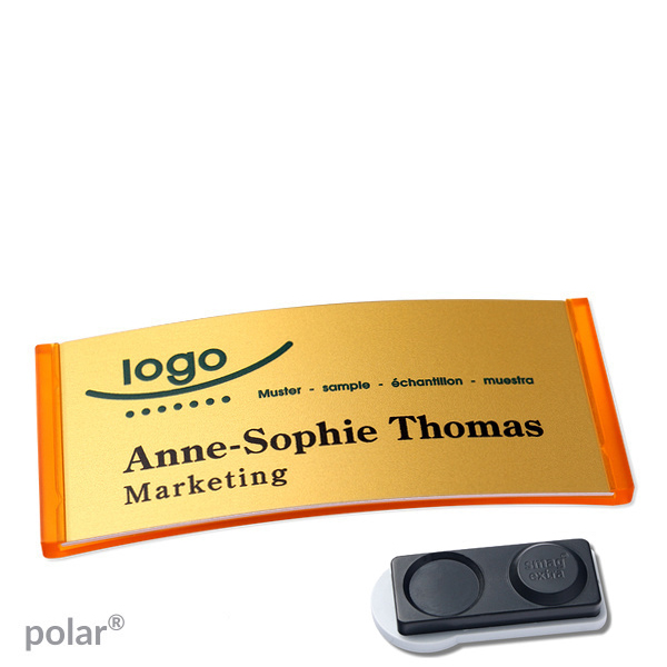 10 Namensschilder polar alu-complete magnet 74 x 34 mm | transluzent|orange | gold | smag Magnet, extra stark, Kunststoff