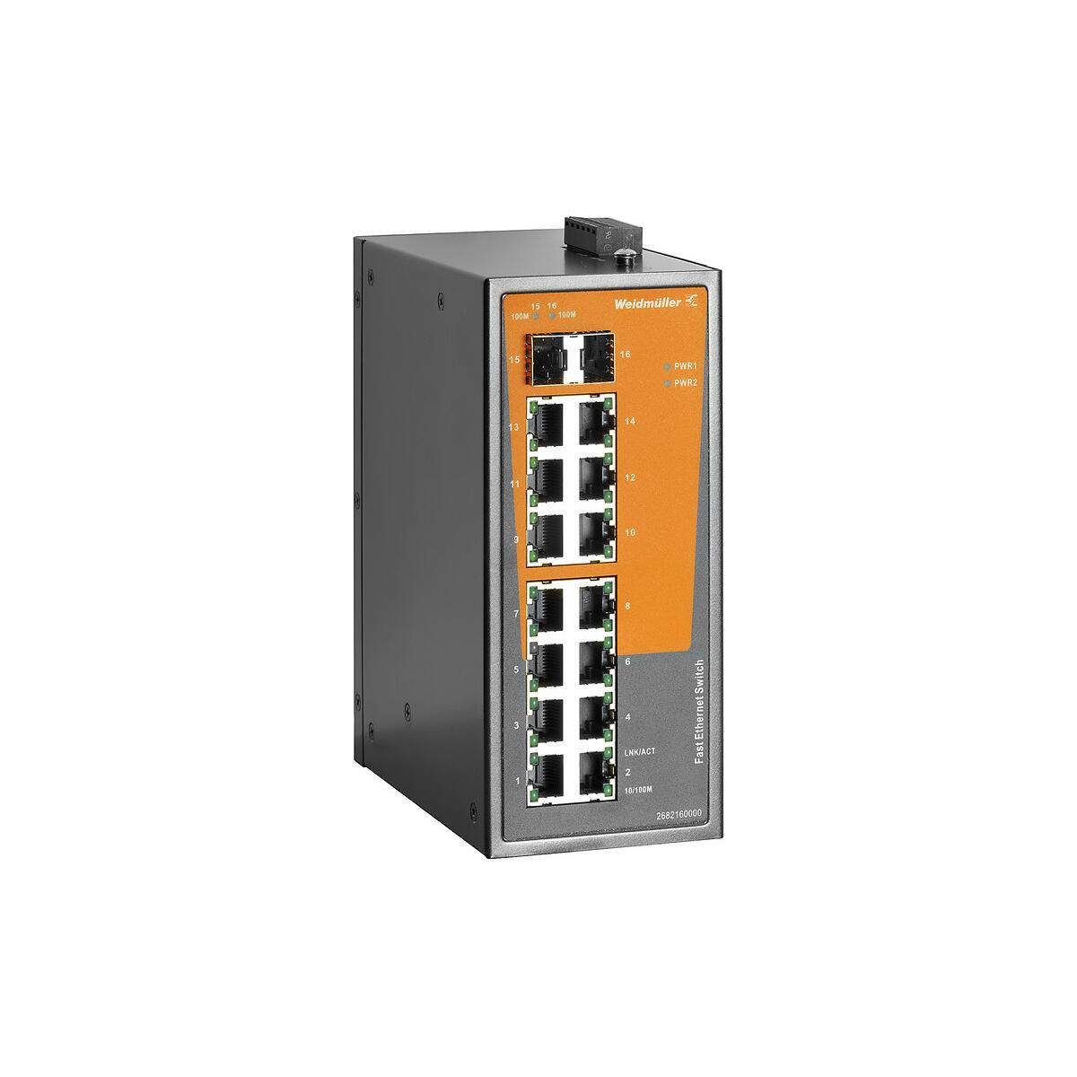 Weidmüller IE-SW-EL16-14TX-2FESFP Netzwerk-Switch, unmanaged, Fast Ethernet, 14x RJ45, 2x Slots 100BaseSFP, IP30 (2682160000)
