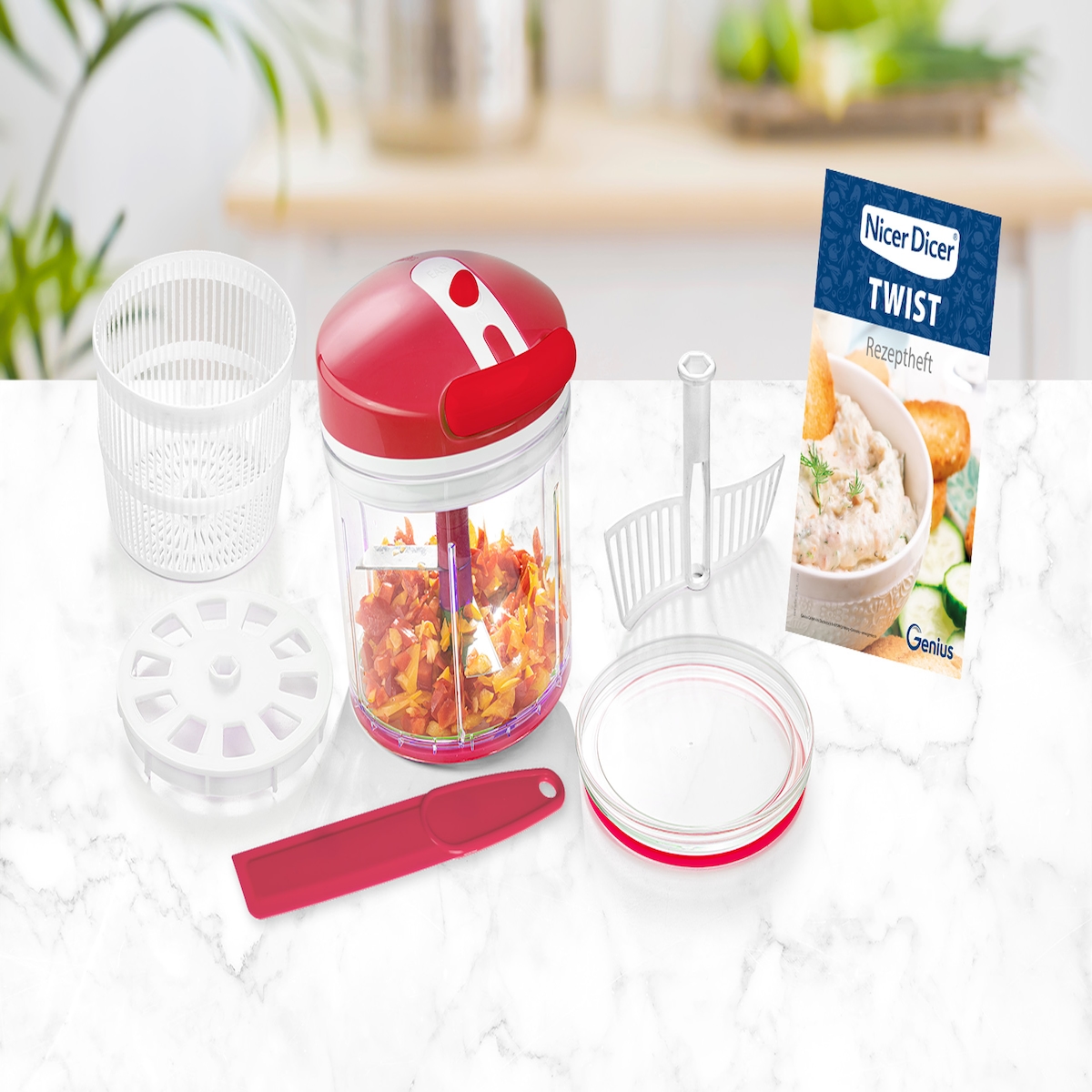 Genius Nicer Dicer Twist Universalzerkleinerer 9-tlg rot - Gemüseschneider manuell mit Seilzug, Salatschleuder & Sieb 1000ml; A29188