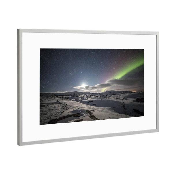 Poster mit Rahmen Silber "Light in the Night" artboxONE - Natur - Mondlicht,Nordlicht,Winterlandschaft,Himmel,Sky