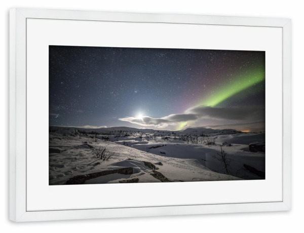 Poster mit Rahmen weiß "Light in the Night" artboxONE - Natur - Mondlicht,Nordlicht,Winterlandschaft,Himmel,Sky