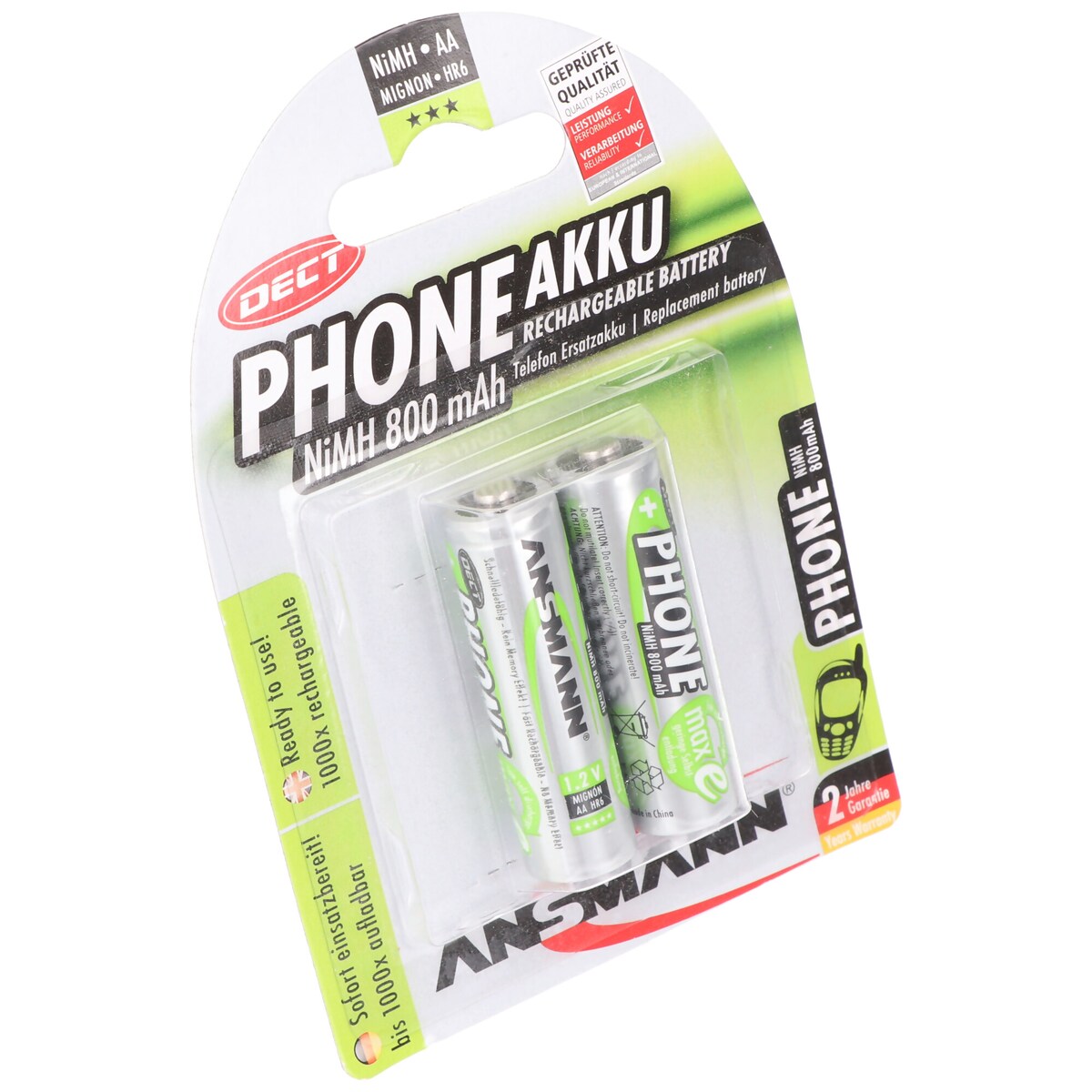 ANSMANN Akku AA Mignon 800mAh 1,2V NiMH für Telefon 2 Stück - wiederaufladbar