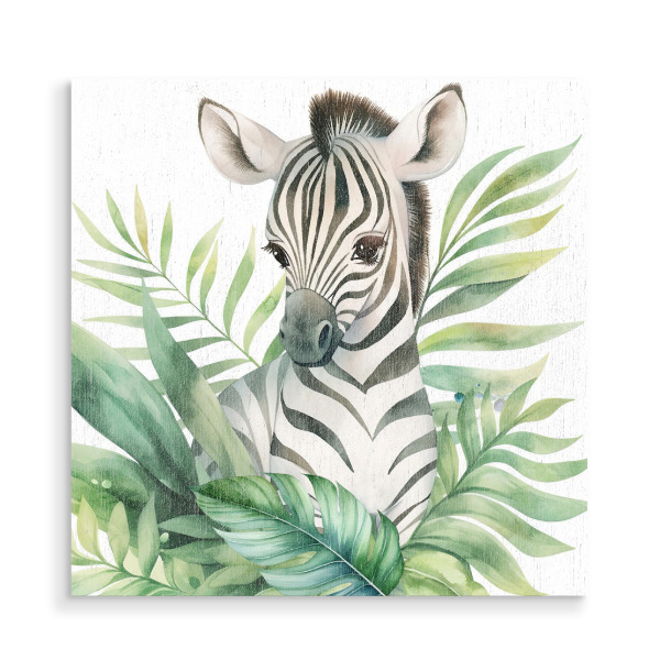 Holzbild "Shy Zebra in the Greens" artboxONE - Für Kinder,Tiere - Baby zebra,Tropical leaves,Watercolor art,Cute animal,Nursery decor,Safari animal