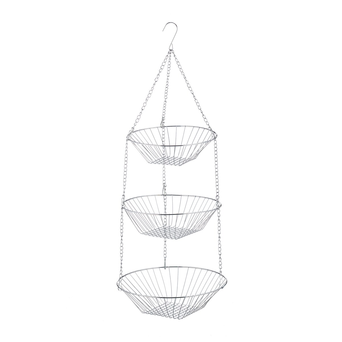 Relaxdays Hängekorb 3 Etagen, hängende Obstkörbe, 3er Etagere für die Decke, Obst, platzsparend in Küche, Stahl, silber