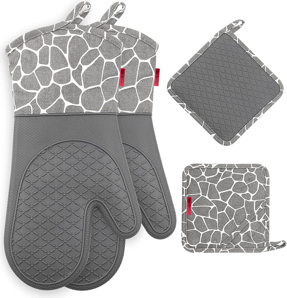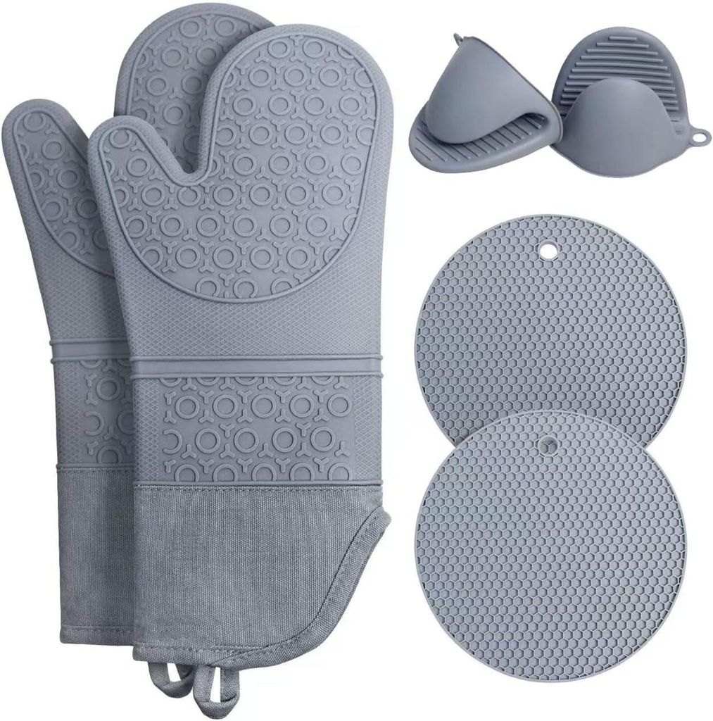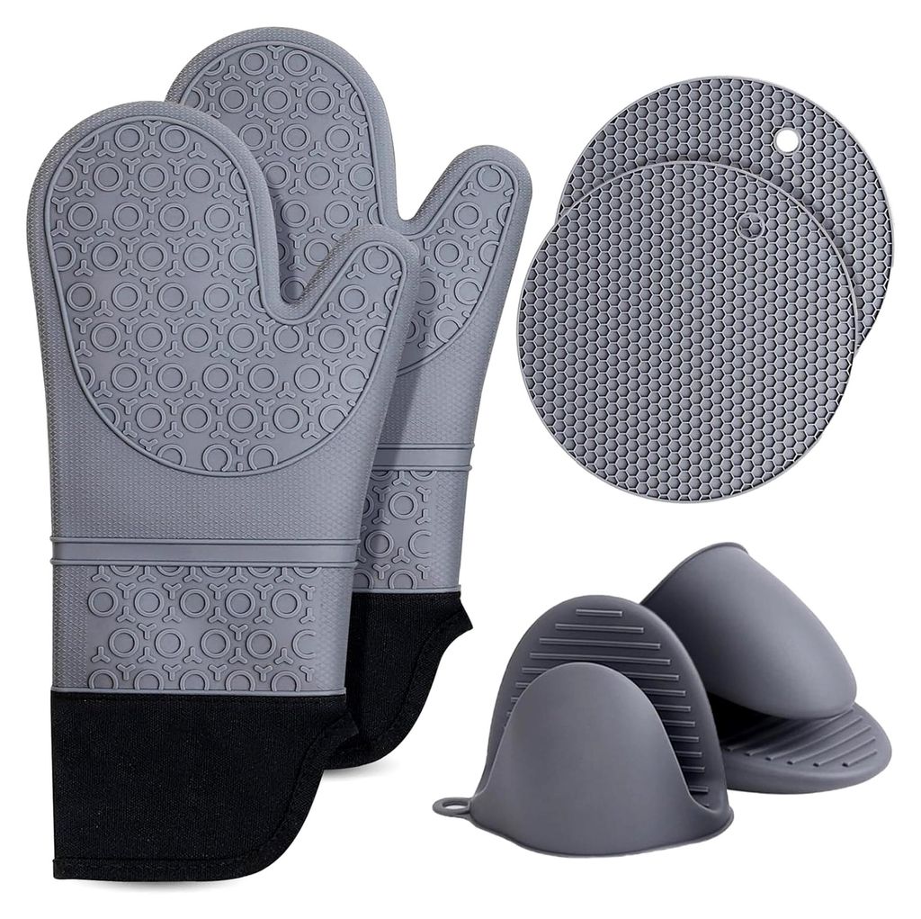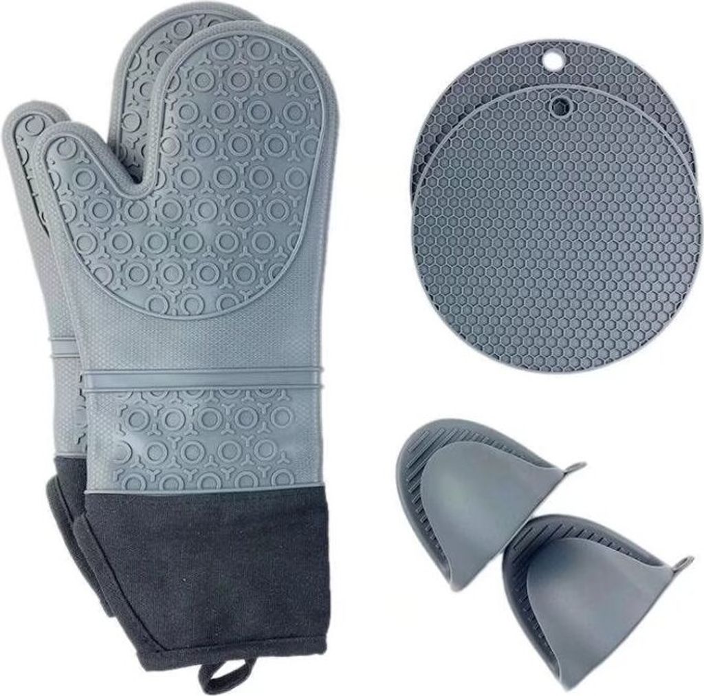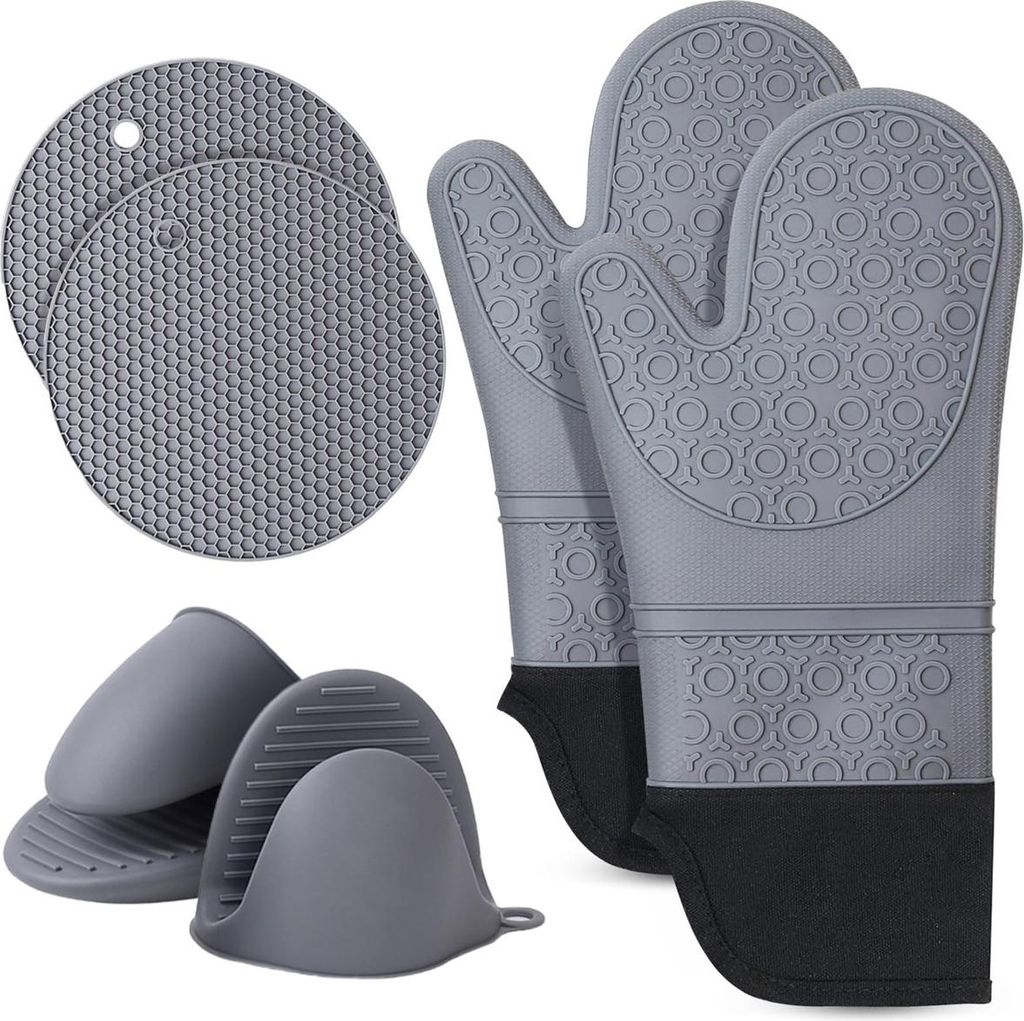 6-tlg. Silikon Ofenhandschuhe Set, hitzebeständig bis 230°C, extra lange Backhandschuhe, inkl. Topflappen & Mini-Greifer, rutschfest, BPA-frei, Grau