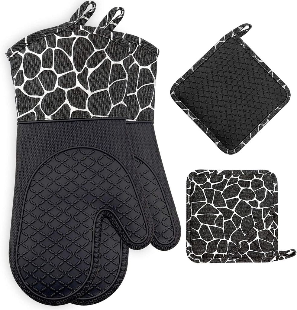 Ofenhandschuh, Topfhandschuhe Anti-Rutsch Hitzebeständige Silikon und Baumwolle 1 Paar und 2 Topflappen (Black)