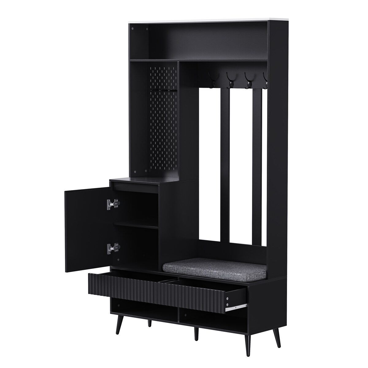 Garderoben-Set 100x35x180 cm mit Schuhbank, 2 Schubladen, 1 Tür, 4 Kleiderhaken, offenes Fach, modernes Flurmöbel, Schwarz