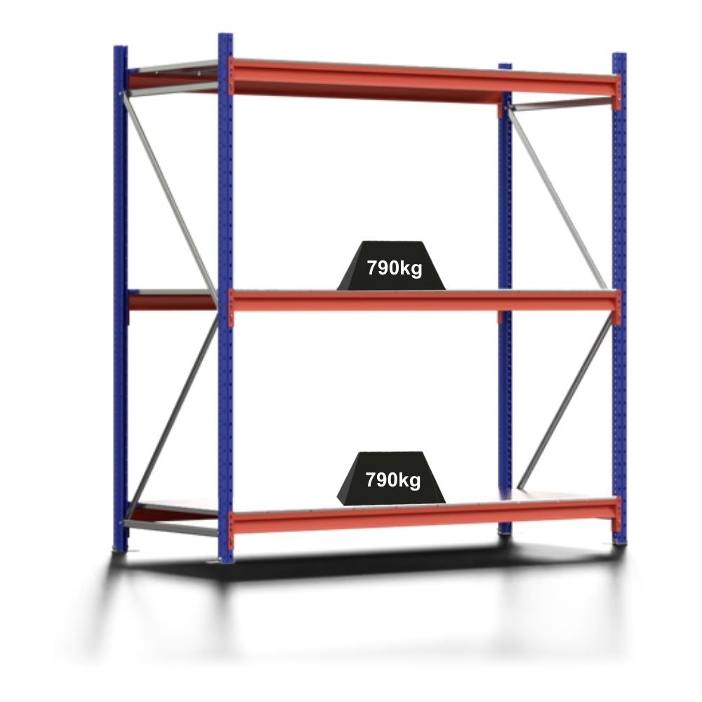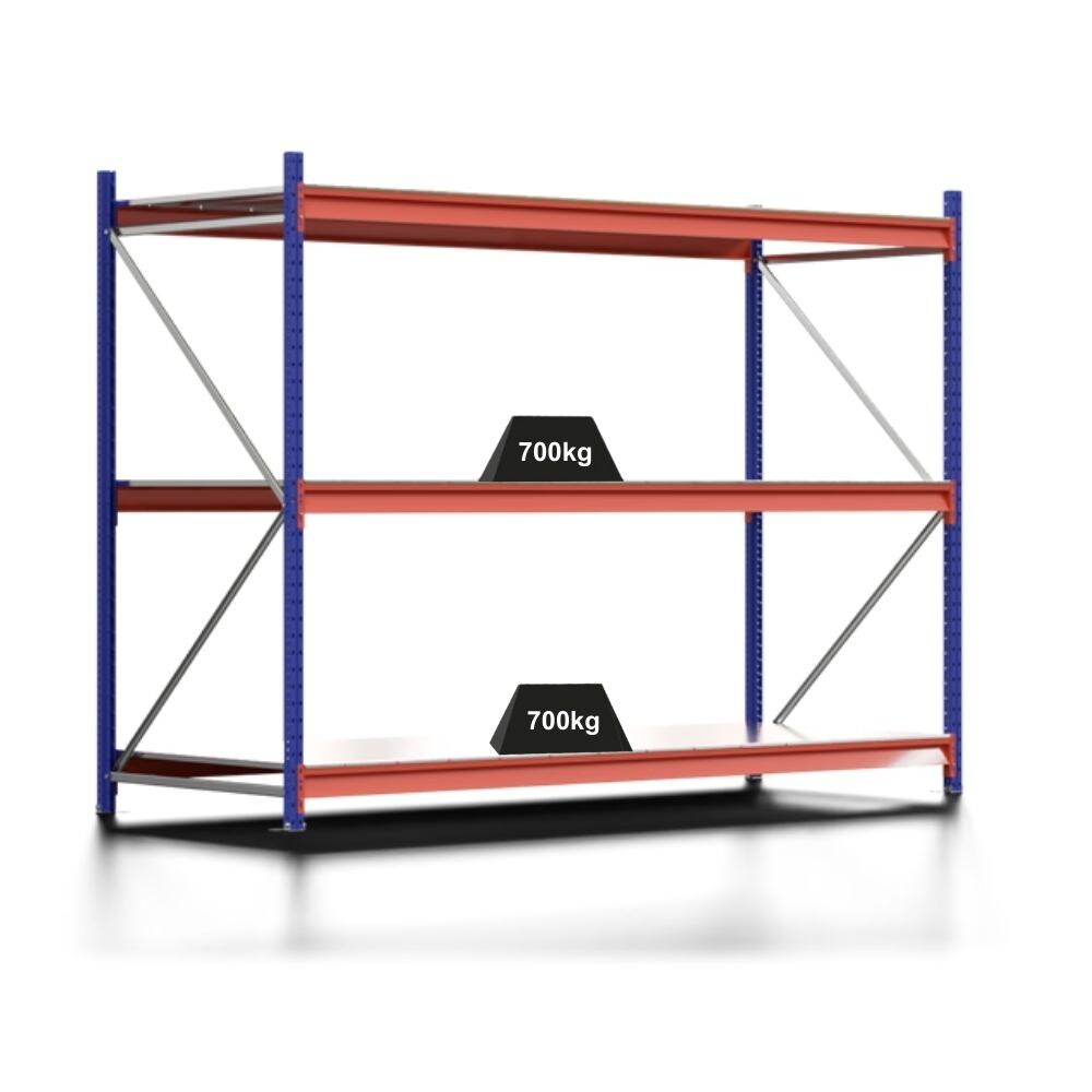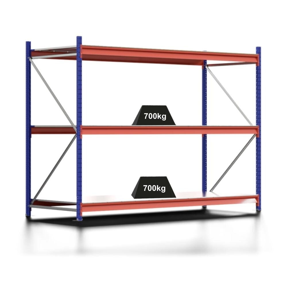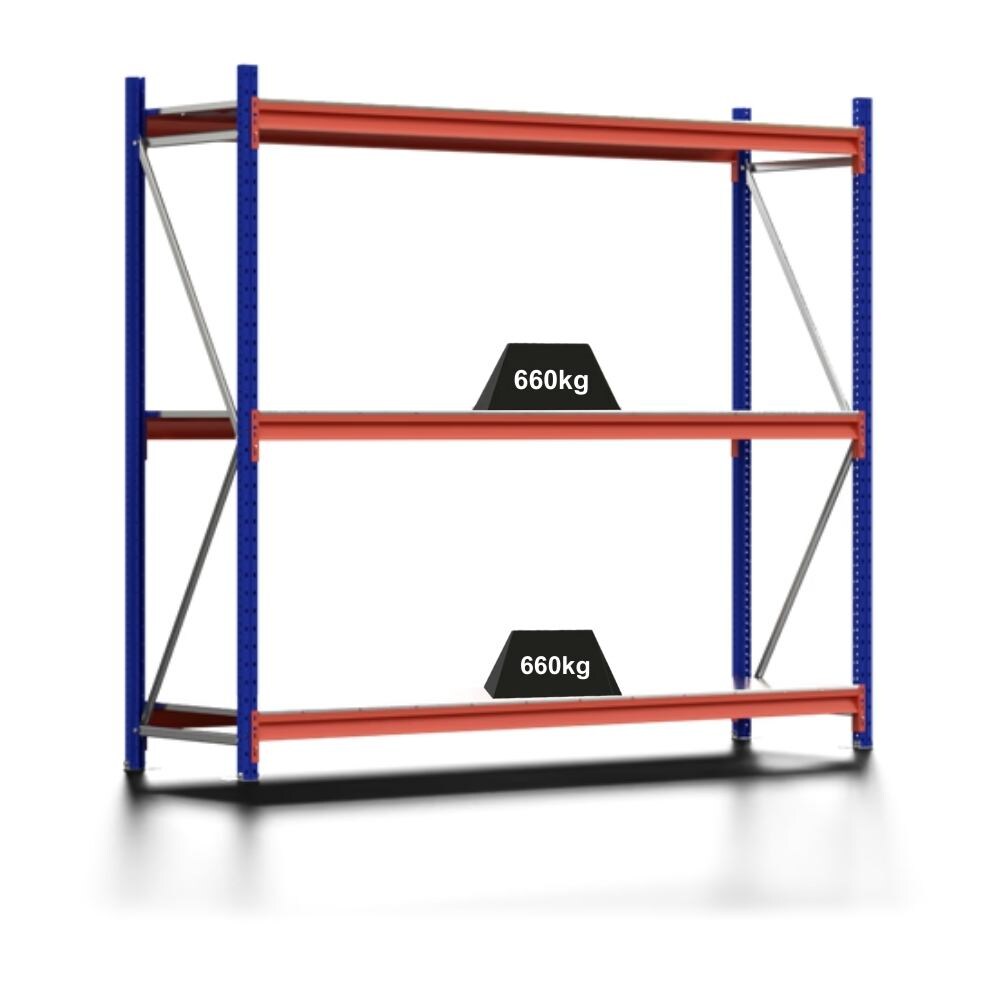 PROREGAL Weitspannregal MOOSE Stecksystem Omega-Profil, Grundregal, HxBxT 200x222x60cm, 3 Ebenen, Spanplatten-Fachboden, Fachlast 660kg, Blau/Orange