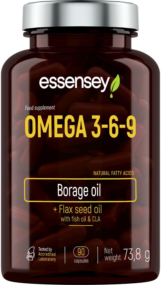 ESSENSEY - Omega 3-6-9 I 500mg pro Tagesdosis I 90 Kapseln I Vitamin E I GLA, ALA, EPA und FHA I 45 Tagesdosen I Leicht zu schlucken I Labor