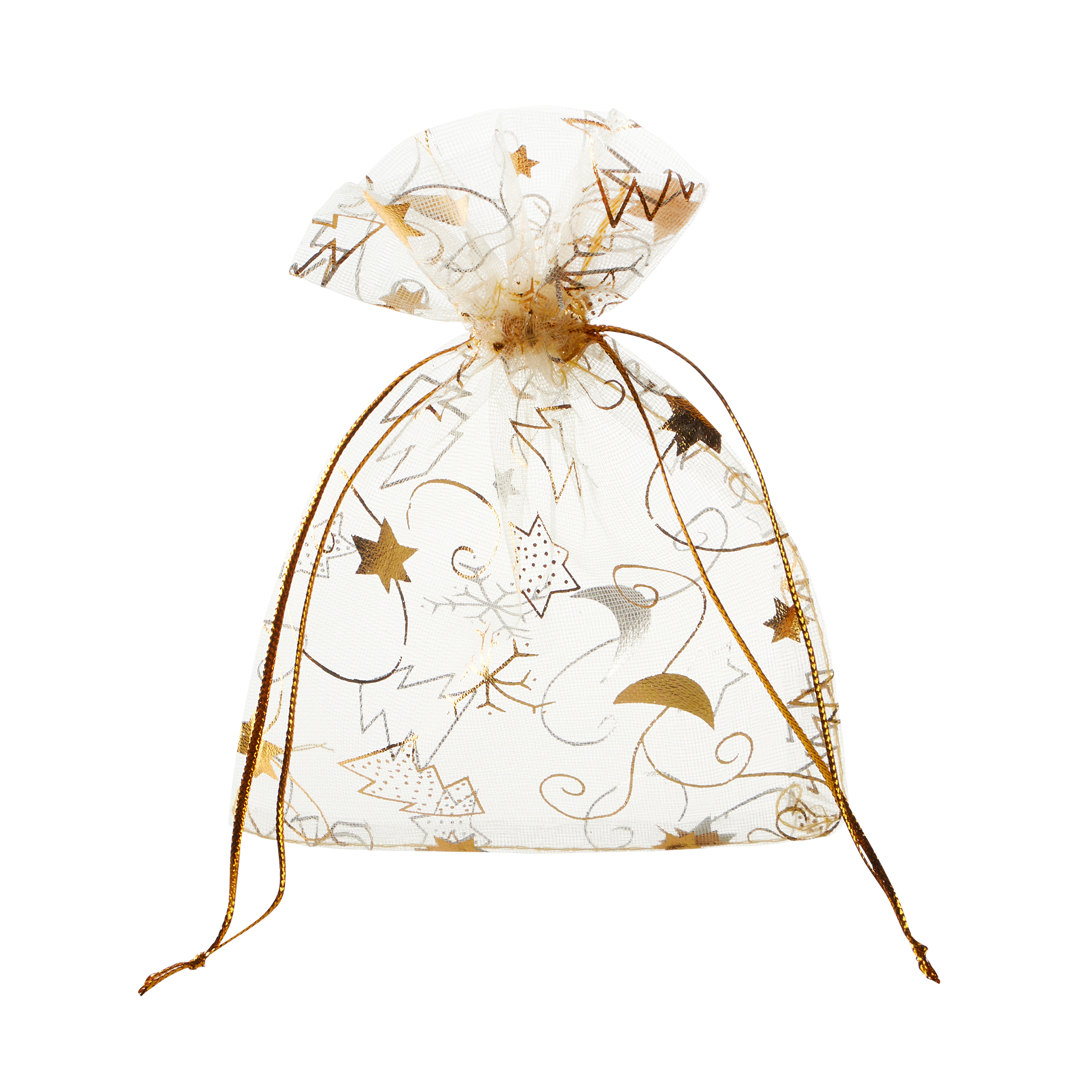 10 Organzasäckchen mit weihnachtlichem Motiv 100 x 130 mm | Weihnachten, gold|beige