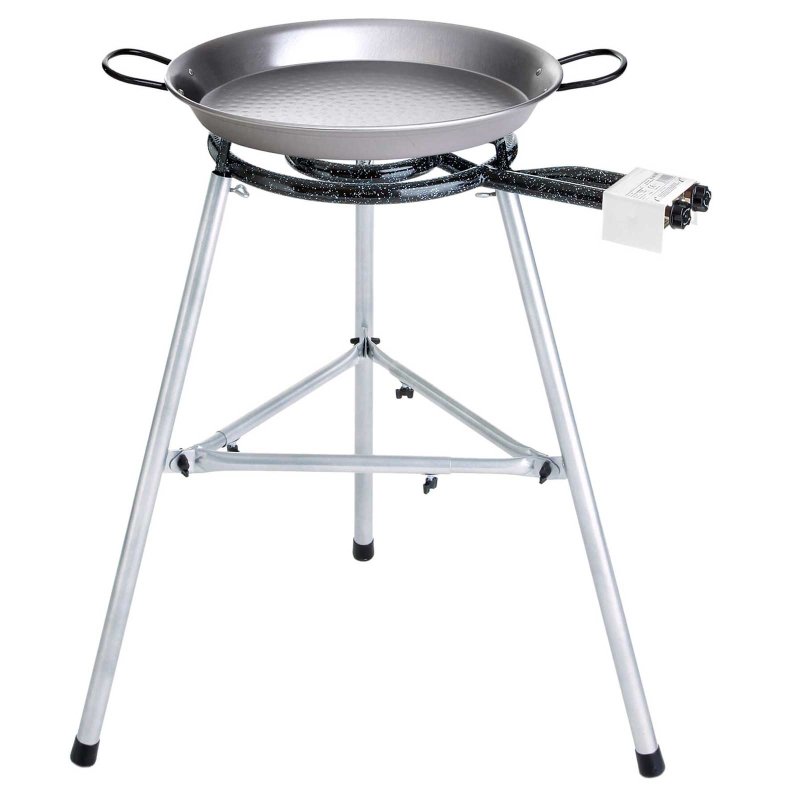 Hochwertiges Paella Grill-Set für Single-Griller: Pfanne Ø 38 cm, 2-Ring-Brenner Ø 30 cm, 7,5 kW, stabiler Dreibein-Ständer, höhenverstellbar