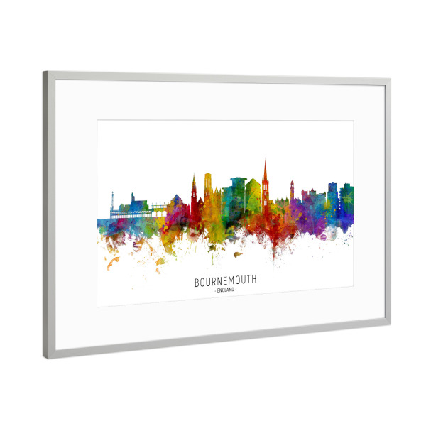 Poster mit Rahmen Silber "Bournemouth England Skyline txt" artboxONE - Städte - Bournemouth,England,Skyline,Cityscape,Stadtbild,Watercolor,Painting