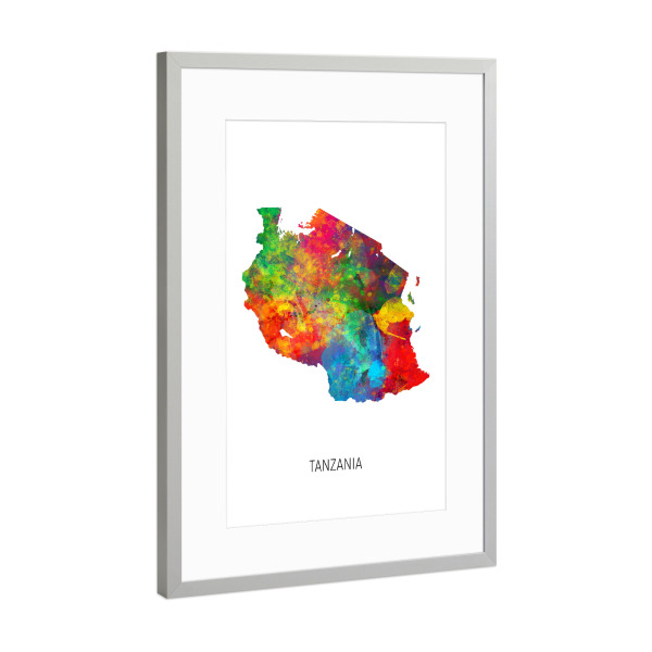 Poster mit Rahmen Silber "Tanzania Watercolor Map" artboxONE - Kartografie - Tanzania,Map,Watercolor,Painting