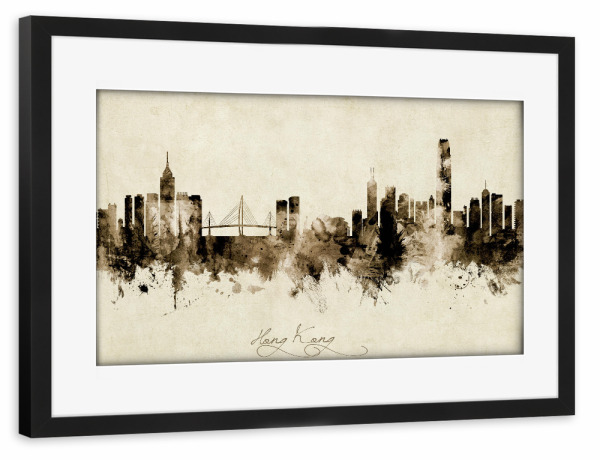 Poster mit Rahmen schwarz "Hong Kong Skyline Sepia" artboxONE - Städte - Hong kong,China,Skyline,Cityscape,Stadtbild,Watercolor,Painting