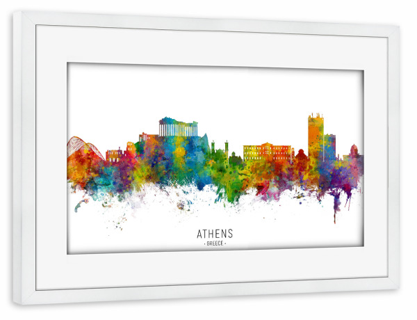 Poster mit Rahmen weiß "Athens Greece Skyline txt" artboxONE - Städte - Athens,Greece,Skyline,Cityscape,Stadtbild,Watercolor,Painting