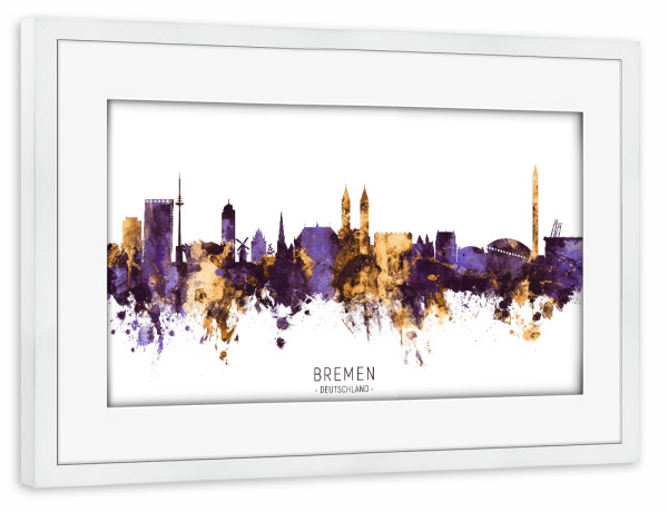 Poster mit Rahmen weiß "Bremen Germany Skyline PurpleGold" artboxONE - Städte - Bremen,Deutschland,Skyline,Cityscape,Stadtbild,Watercolor,Painting
