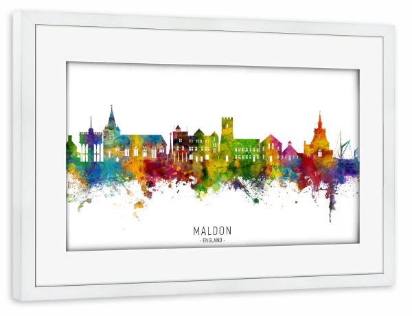 Poster mit Rahmen weiß "Maldon England Skyline txt" artboxONE - Städte - Maldon,England,Skyline,Cityscape,Stadtbild,Watercolor,Painting,Colorful,Bunt