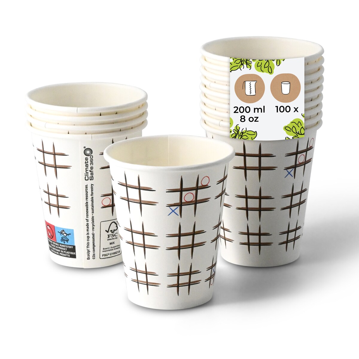 BIOZOYG Pappbecher bedruckt TicTacToe 100 Stück 200 ml / 8 oz, Ø 80 mm, weiß - Kaffeebecher to go - Pappe beschichtet mit PE - Trinkbecher/Einweg