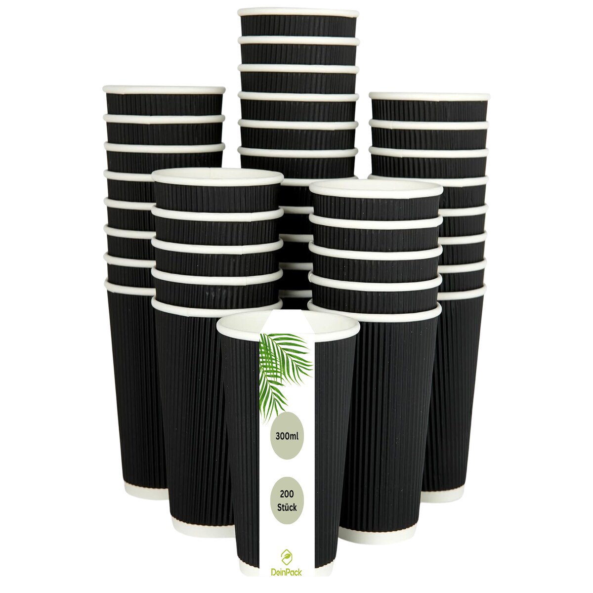DeinPack 200 Riffelbecher schwarz 300 ml doppelwandig to Go Pappbecher aus schwarzem Kraftkarton Kaffeebecher