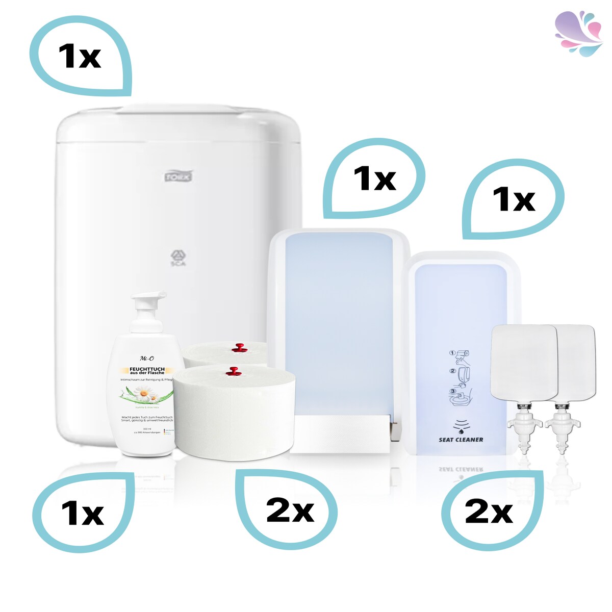 Blanc HYGIENIC KOMPLETT-SET Damentoilette: Toilettenpapierspender + Sitzreinigung + Intimschaum + Hygienezubehör & Füllmittel