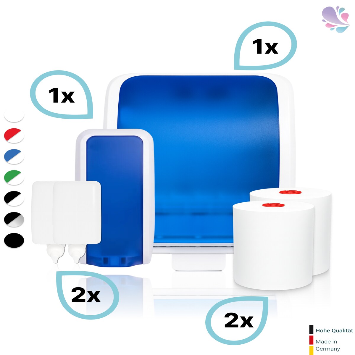 Blanc HYGIENIC KOMPLETT-SET Waschraum MANUELL: Handtuchrollenspender AUTOCUT + 2 TAD Handtuchrollen + Schaumseifenspender MANUELL+ 2 Kartuschen