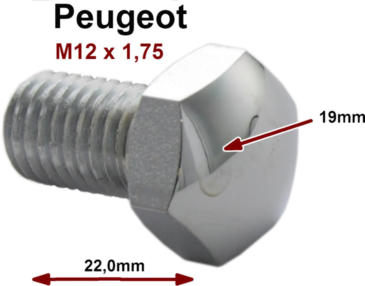 Radkappen Schraube. Passend für Peugeot 203, 403, 404. Gewinde: M12 x 1,75. Länge: 22mm. Werkzeug: 19mm.