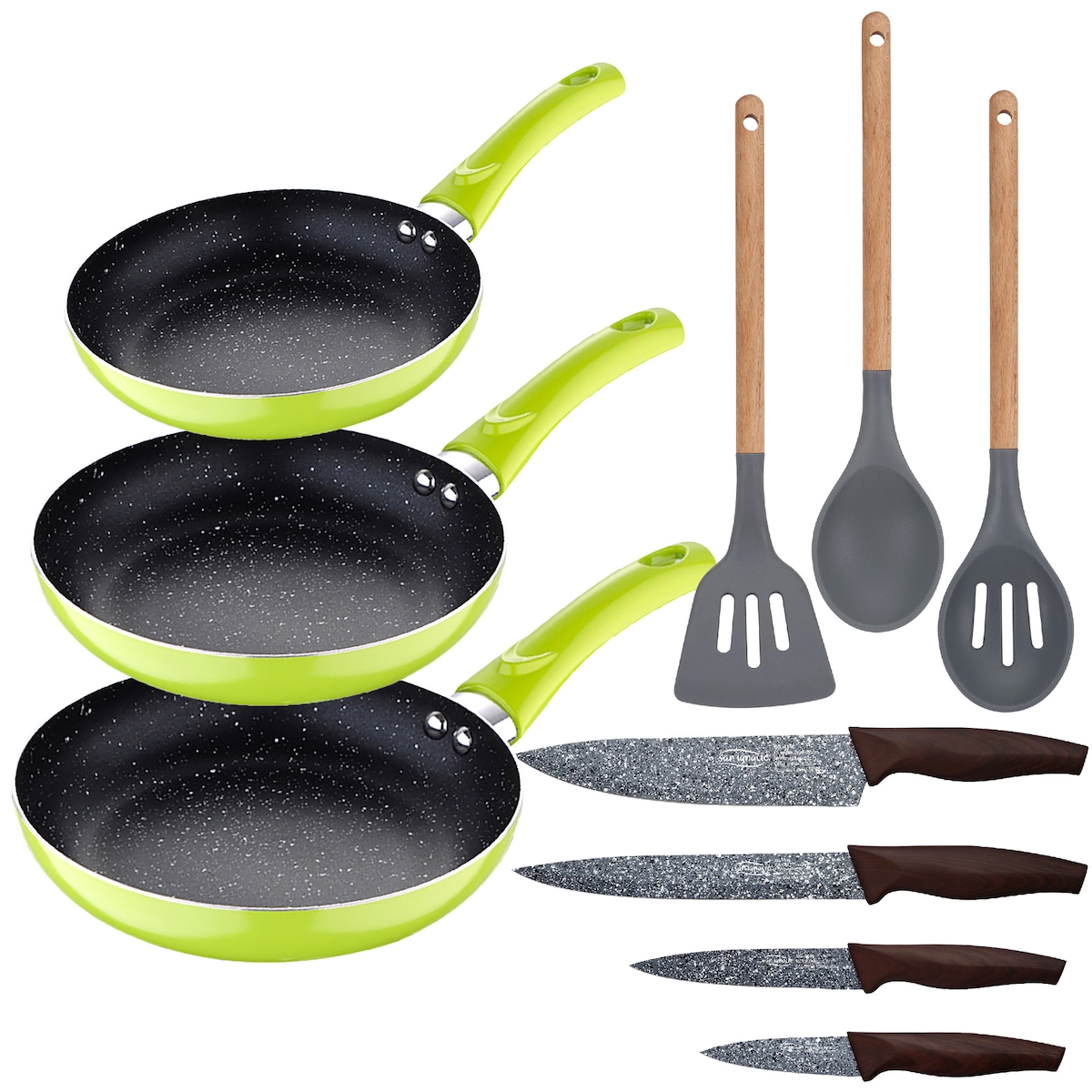 San Ignacio - Set 3Pc Pfanne (20/24/28 cm) aus gepresstem Aluminium mit Set 3Pc Küchenutensilien aus Silikon und Holz mit 4Pc Edelstahlmessern