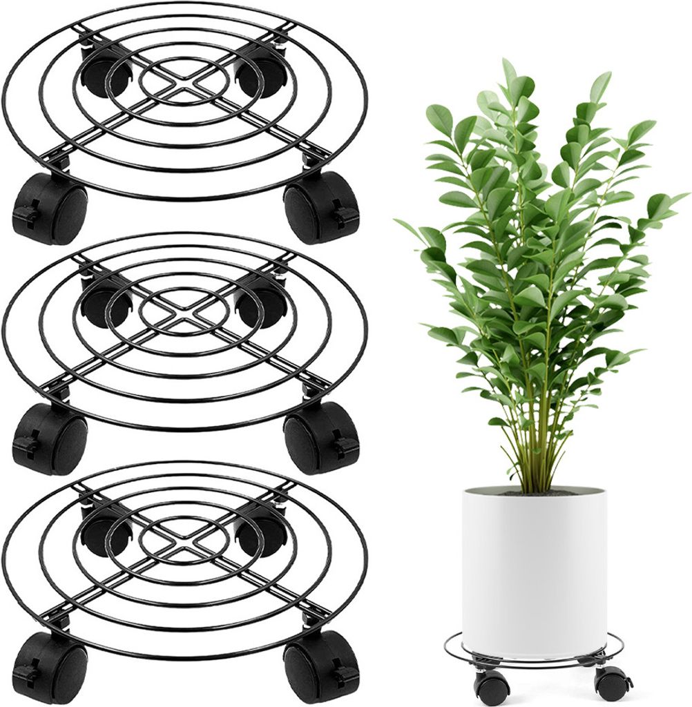 3er-Pack Pflanzenwagen mit Raedern/27 cm runder Topfwagen aus Metall/robuster beweglicher Pflanzenwagen aus Metall fuer den Innen- und Aussenbereic...