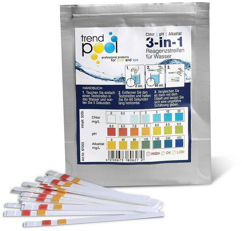 Teststreifen 3-in-1 für Wasseranalyse Chlor, pH-Wert und Gesamtalkalität, 50 Stück