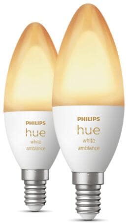 Philips Hue White Ambiance E14 Lampe, Doppelpack, Kerze, 5,2W, 470lm, 4000K (929002294404)
