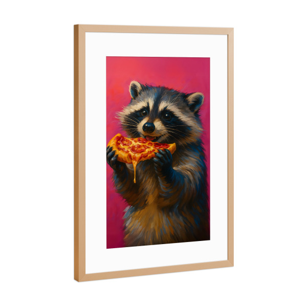 Poster mit Rahmen Kupfer "Pizza-Party mit Waschbär" artboxONE - Tiere,Essen & Trinken,Lustig