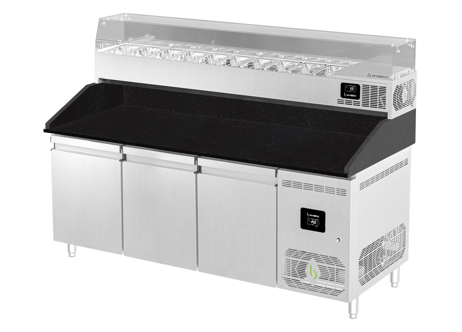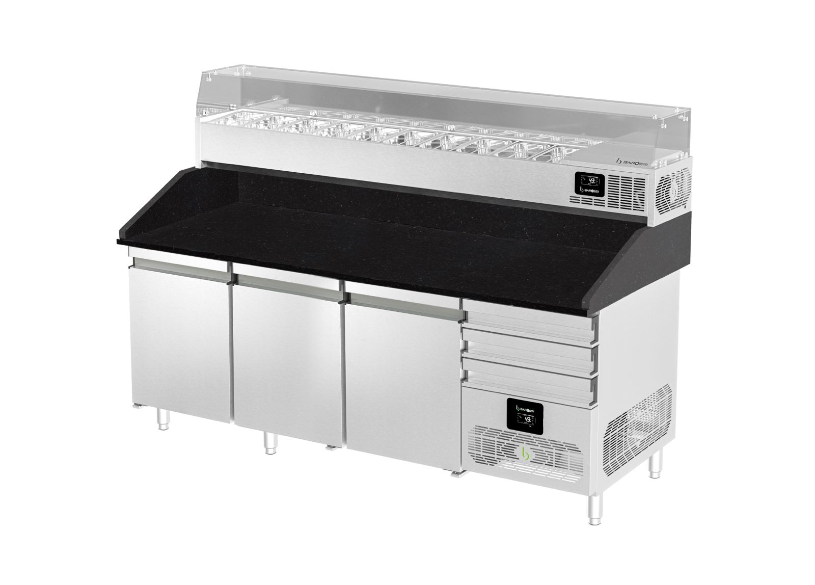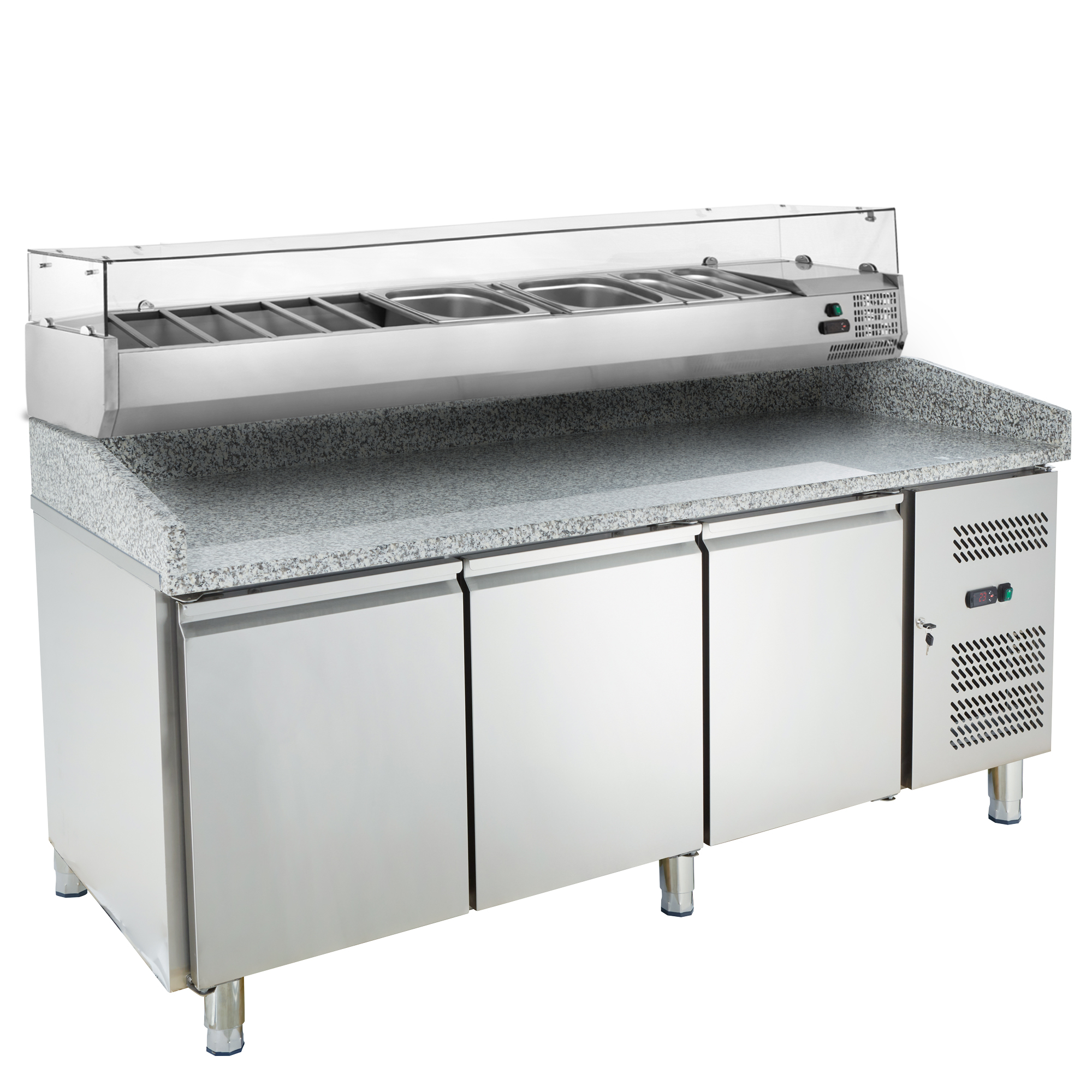Pizza-Kühltisch 202x88x130cm mit 3 Türen inkl. Kühlaufsatzvitrine, schwarzer Granit | Pizzakühltisch, GastroHero