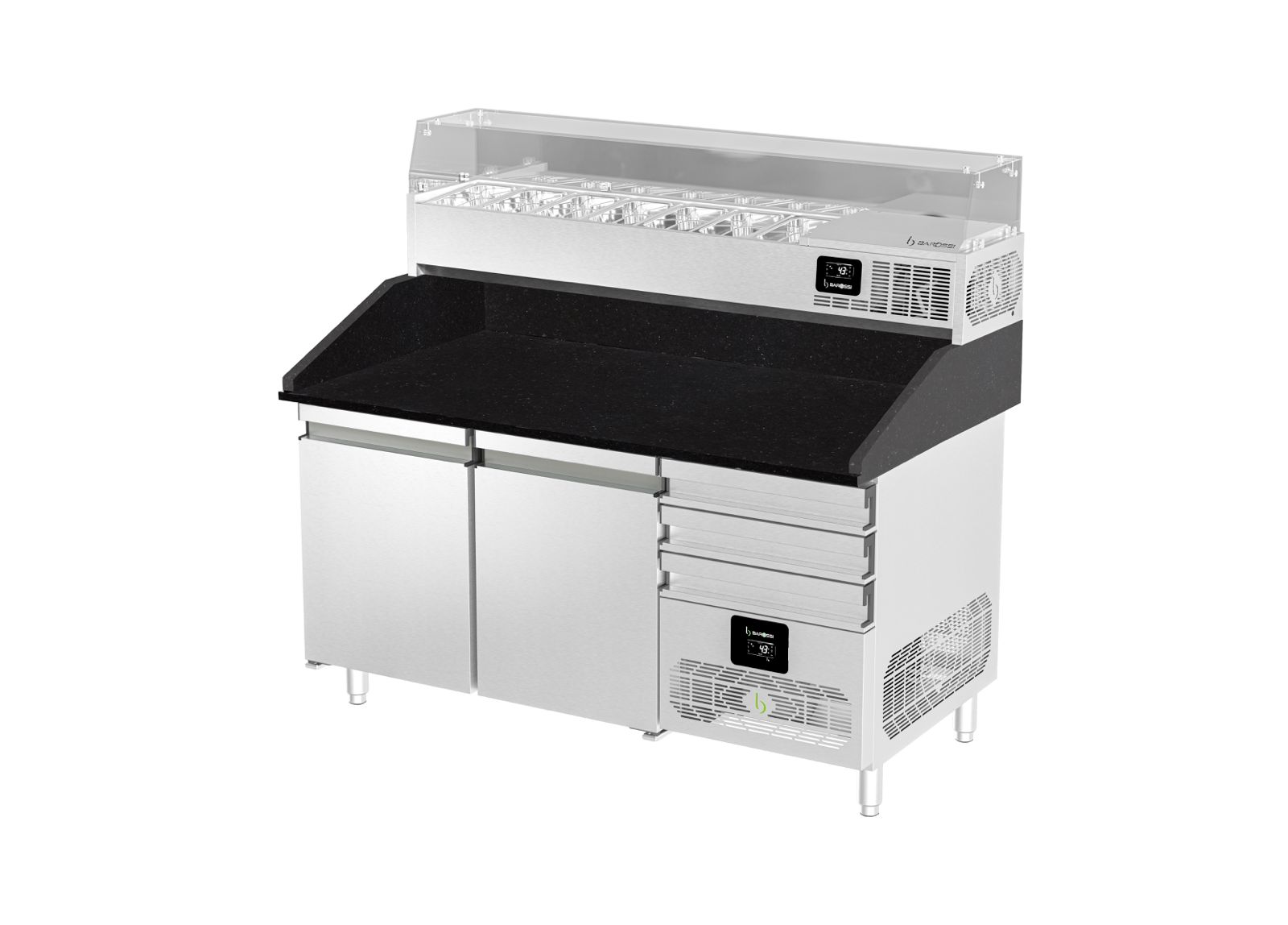 Pizza-Kühltisch 160x88x130cm mit 2 Türen & 3 ungekühlte Schubladen inkl. Kühlaufsatzvitrine, schwarzer Granit | Pizzakühltisch, GastroHero