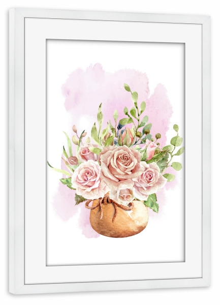 Poster mit Rahmen weiß "Blumen im Stoffsack" artboxONE - Floral - Blume,Pflanze,Erde,Blühen,Aquarell,Flora,Garten,Topf,Plant,Flowers