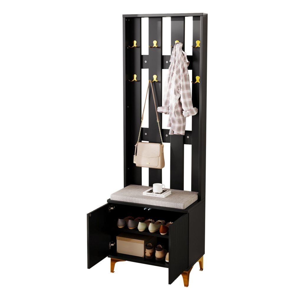 3-in-1 Kleiderschrank mit Schuhaufbewahrung, 8 doppelte Haken für Mäntel, Polsterbank mit Leinenstoff,erhöhtes Design mit goldenen Metallfüßen...