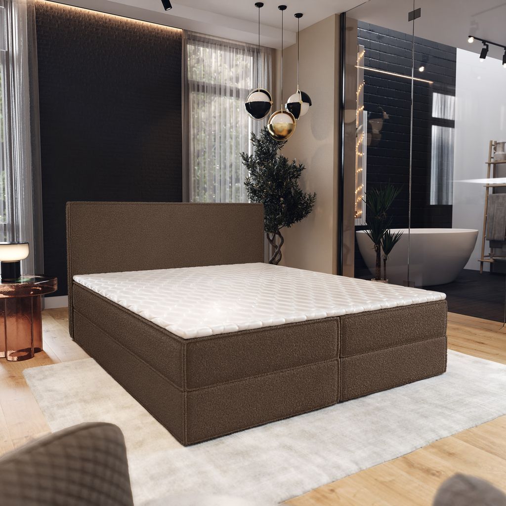 Bett, Boxspringbett FARO PLUS mit 2-Matrazen und Topper Visco, Doppelbett, Schlafzimmer, Polsterbett, 140x200 cm(Braun -AURA 04)