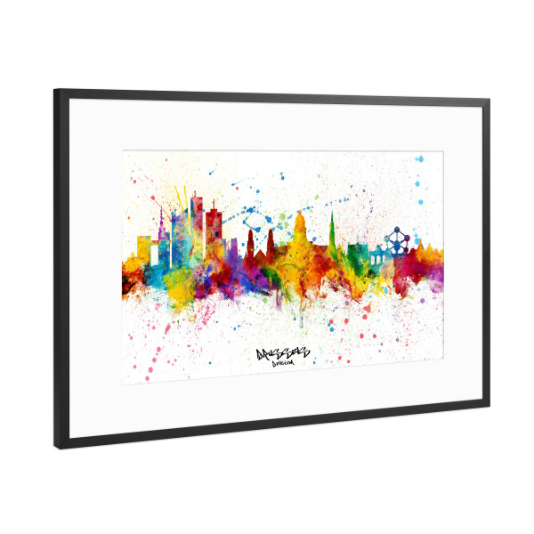 Poster mit Rahmen Schwarz (Metallic) "Brussels Belgium Skyline Splash" artboxONE - Städte