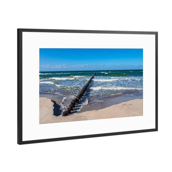 Poster mit Rahmen Schwarz (Metallic) "Sand, Buhne und Wellen" artboxONE - Natur,Reise,Reise / Strand und Meer