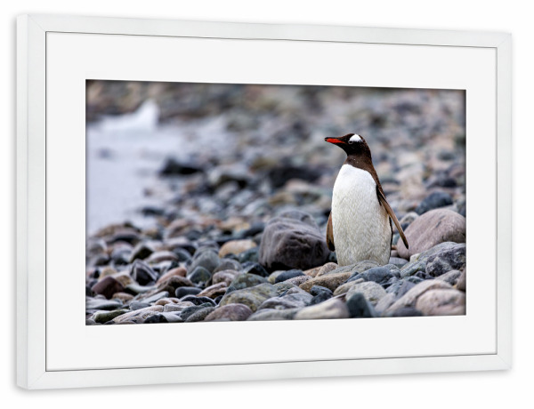 Poster mit Rahmen weiß "Strand mit Pinguin" artboxONE - Natur,Tiere - Antarktis,Südpol,Pinguin,Eselspinguin,Vogel,Wildlife