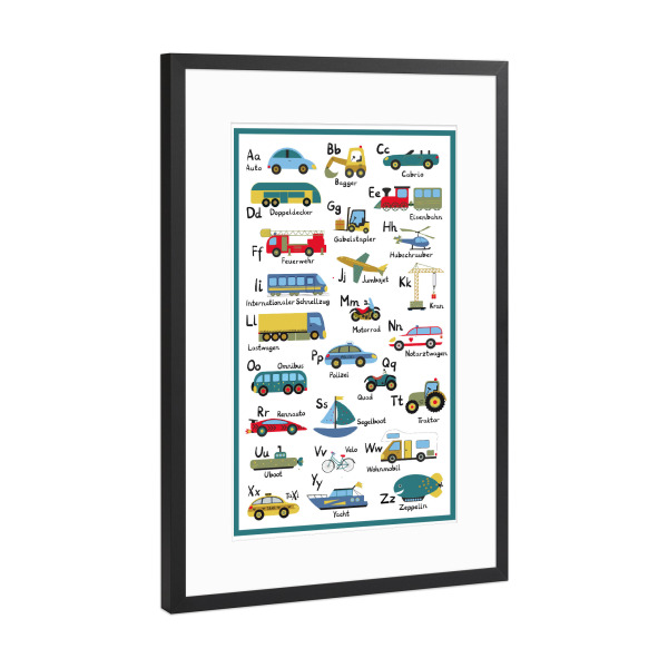 Poster mit Rahmen schwarz "ABC Lernposter Autos und Fahrzeuge" artboxONE - Für Kinder,Automobile,Buchstaben