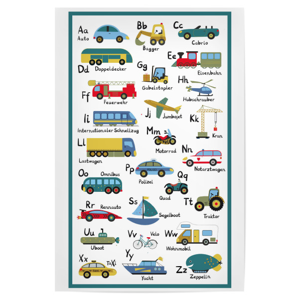 Poster mit weißem Rahmen "ABC Lernposter Autos und Fahrzeuge" artboxONE - Für Kinder,Automobile,Buchstaben