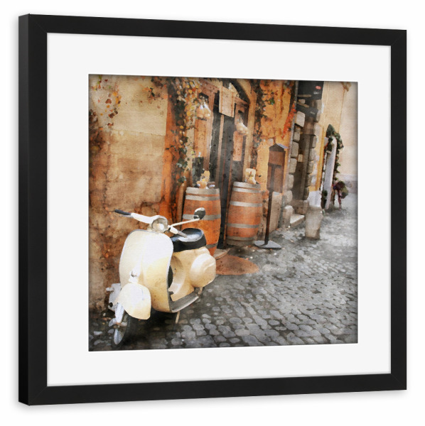 Poster mit Rahmen schwarz "Weißes Moped" artboxONE - Städte,Architektur,Automobile - Reisen,Fahrzeuge,Moped,Weiß,Gasse,Straßenansicht,Stadt