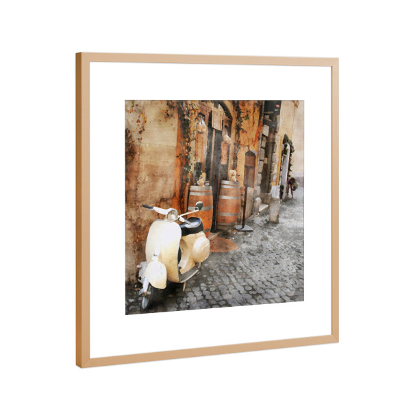 Poster mit Rahmen Kupfer "Weißes Moped" artboxONE - Städte,Architektur,Automobile - Reisen,Fahrzeuge,Moped,Weiß,Gasse,Straßenansicht,Stadt