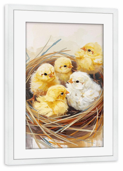 Poster mit Rahmen weiß "Küken im Nest" artboxONE - Tiere - Nest,Geburt,Erwachen,Frühling,Vögel,Küken,Hühner,Flauschig,Gefider,Kükenbabies,Ostern