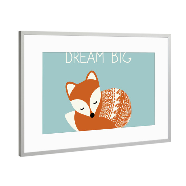Poster mit Rahmen Silber "Dream Big Fuchs" artboxONE - Für Kinder - Dream big fuchs,Schlafend,Süß,Vintage,Retro,Geschenk,Baby,Kinderzimmer,Geburt,Blau