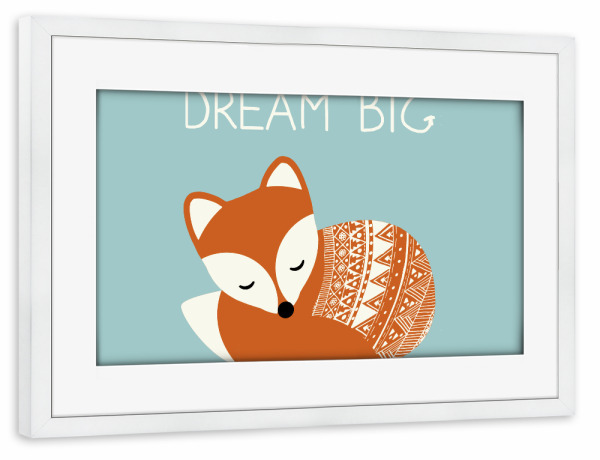 Poster mit Rahmen weiß "Dream Big Fuchs" artboxONE - Für Kinder - Dream big fuchs,Schlafend,Süß,Vintage,Retro,Geschenk,Baby,Kinderzimmer,Geburt,Blau