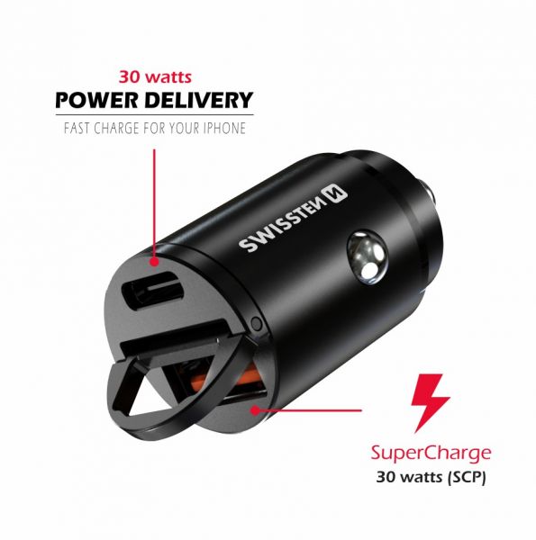 Swissten Car Adapter Power Delivery USB-C + Super Charge 3.0 30W NANO - Swissten