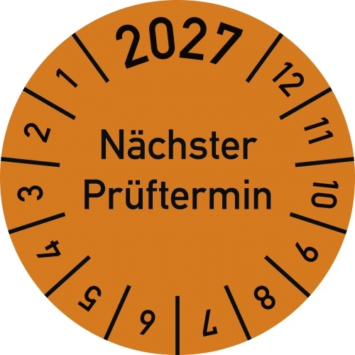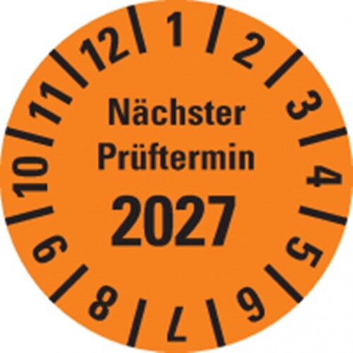 Dreifke Prüfplakette Nächster Prüftermin 2027, orange, Polyesterfolie, Spez., Ø20mm, 36 Stk.