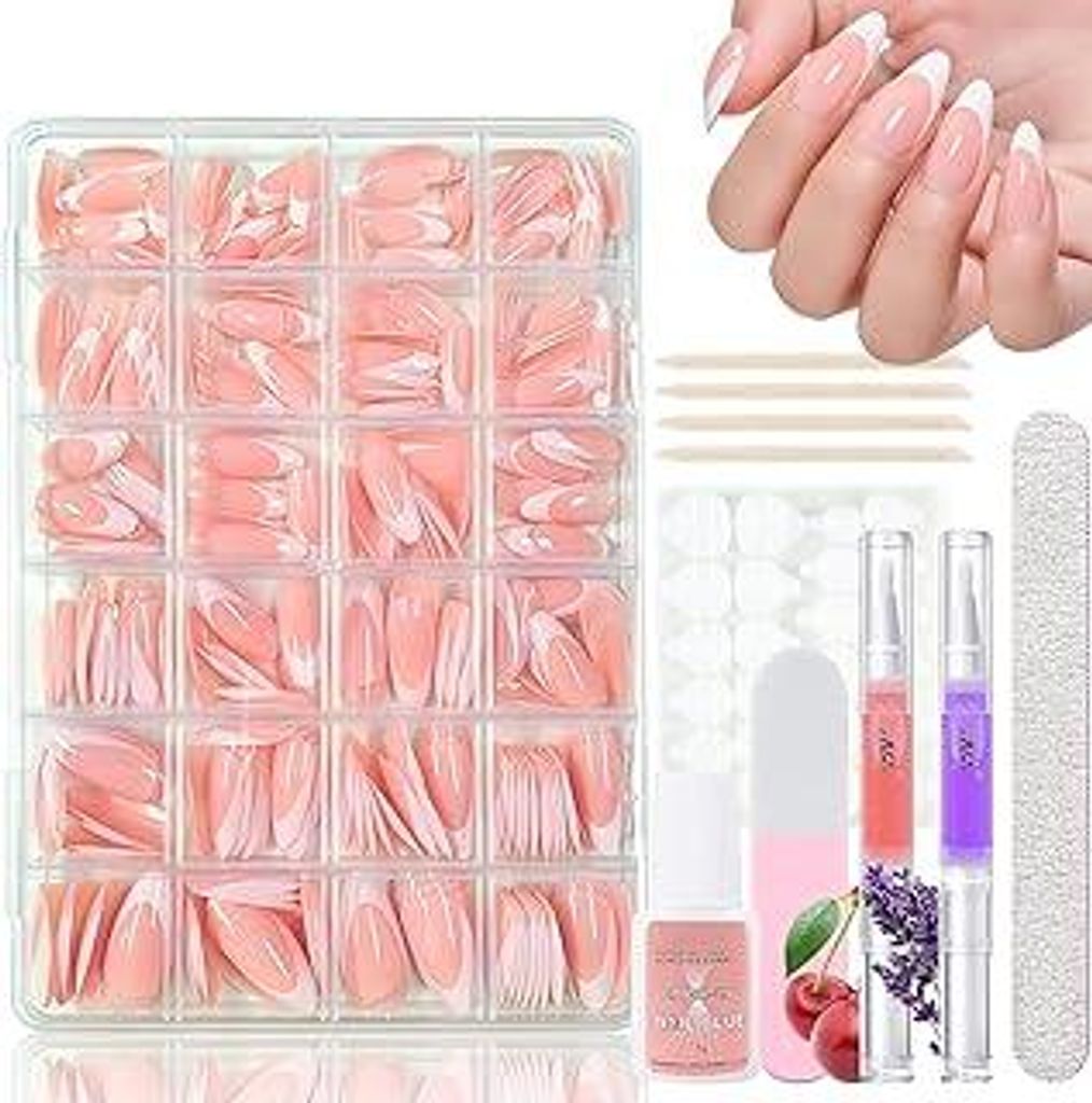 Virellay 360 Stück French Press on Nails Mandel Long, Alomnd Künstliche Nägel Zum Aufkleben French mit 2 Pcs Nagelöl Stift, Nail Tips Almond, L...